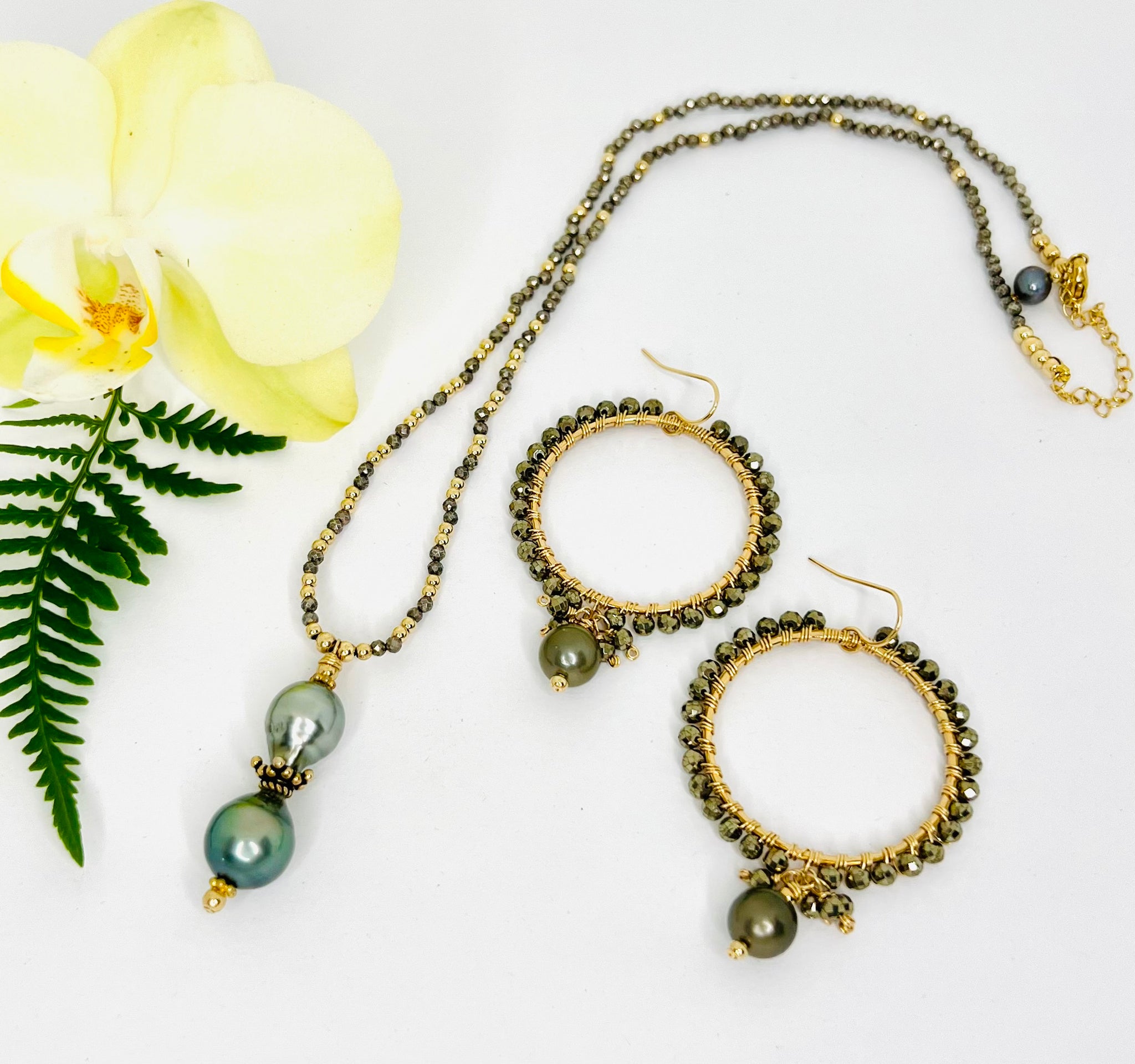 A modern twist on a classic style, these handcrafted hoops feature glimmering pyrite beads for a hint of earthy shimmer. Lightweight, elegant, and effortlessly cool—perfect for everyday wear or stacking with your favorite studs.